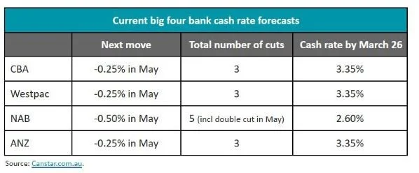 All four big banks are forecasting further drops, with NAB even tipping a double cut in May, taking the rate down to 3.60%.